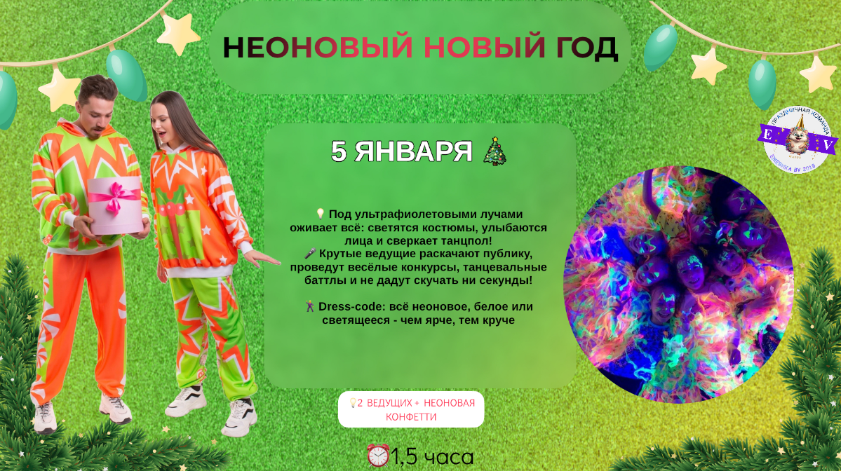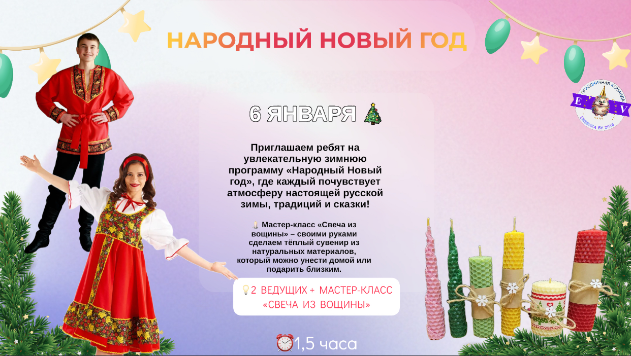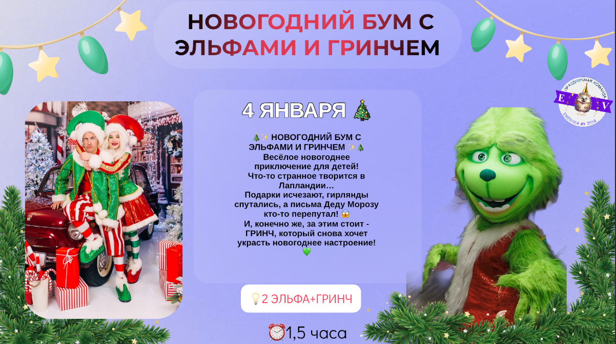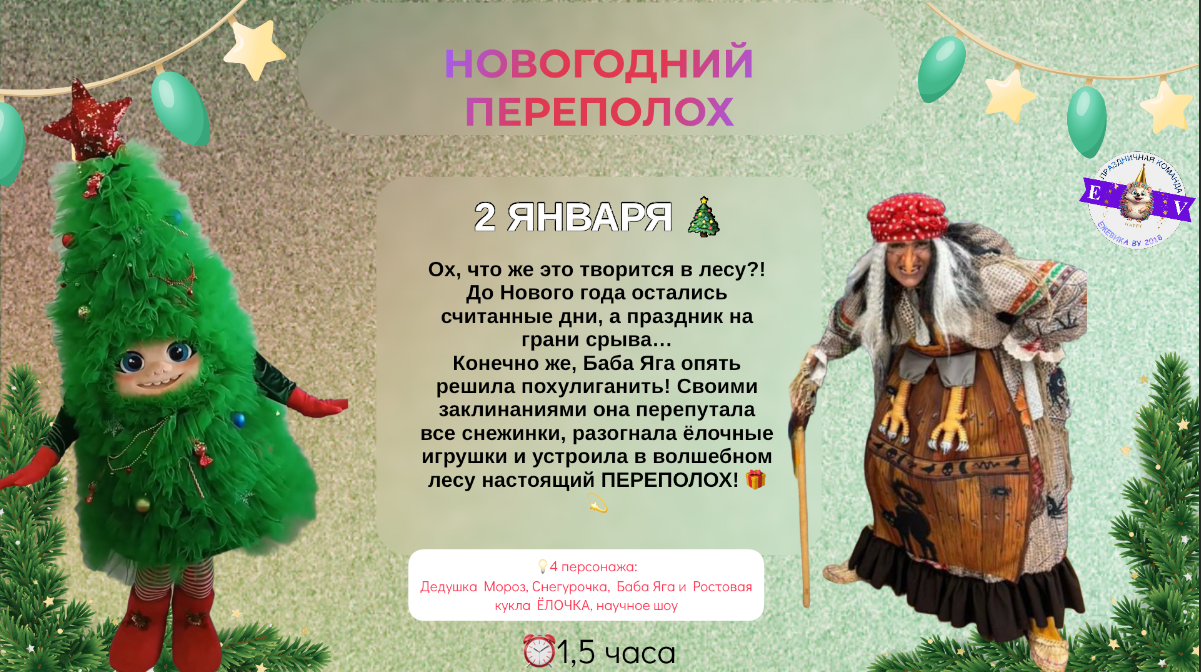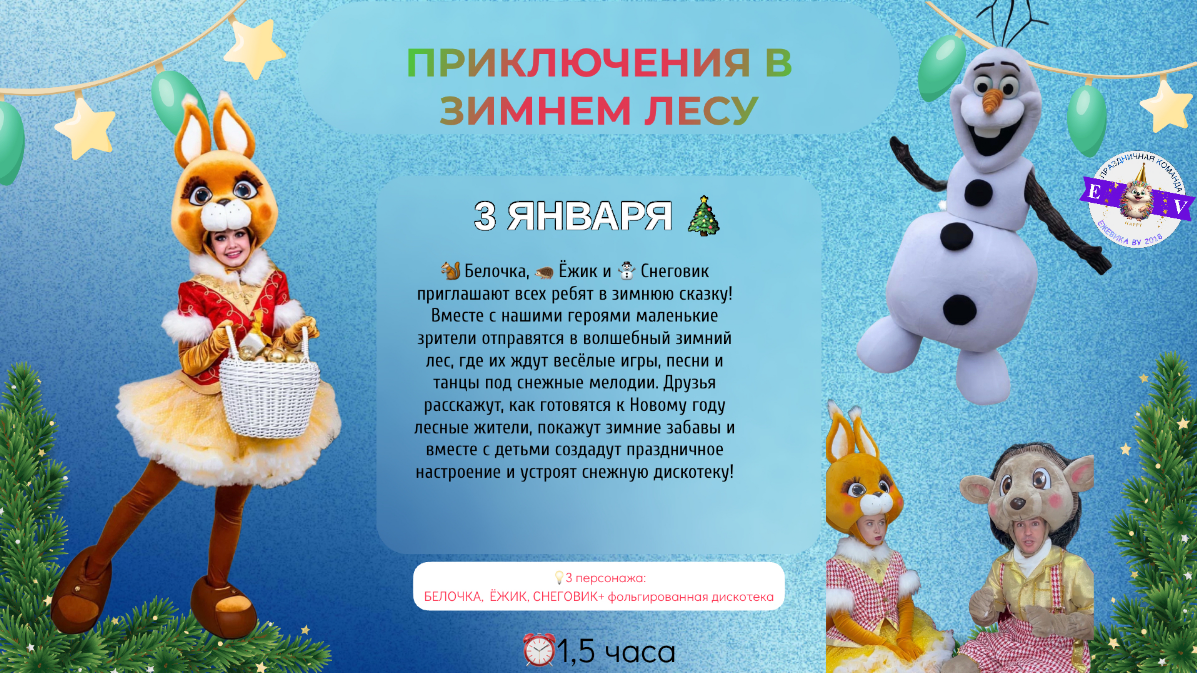 Только у нас, ваши крохи попадут в праздничную атмосферу Новогодней сказки, где их ждут яркие персонажи и незабываемые события с вкусными подарками и эмоциями…Наши аниматоры устроят незабываемые приключения и будут дарить улыбки на протяжении всех каникул.